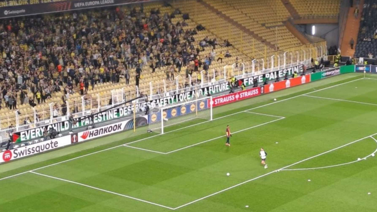 Sarı-lacivertli taraftarlar Chobani Stadyumu’nda oynanan maçta Gazze’ye destek olmak amacıyla “Filistin’deki her çocuk güvenliği, sevgiyi ve geleceği hak ediyor”, “Özgür Filistin” yazılı pankartlar ve Filistin bayrağı açtı.